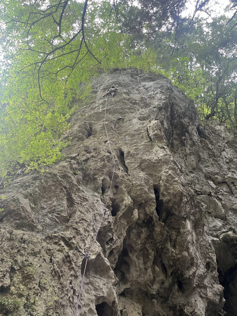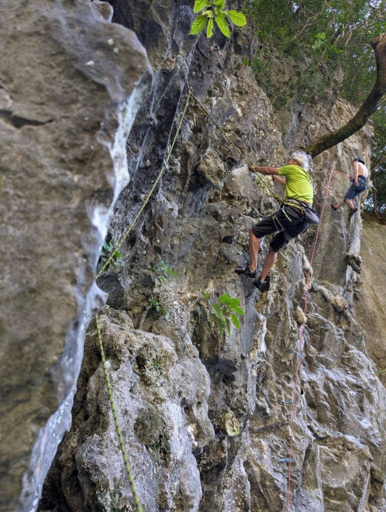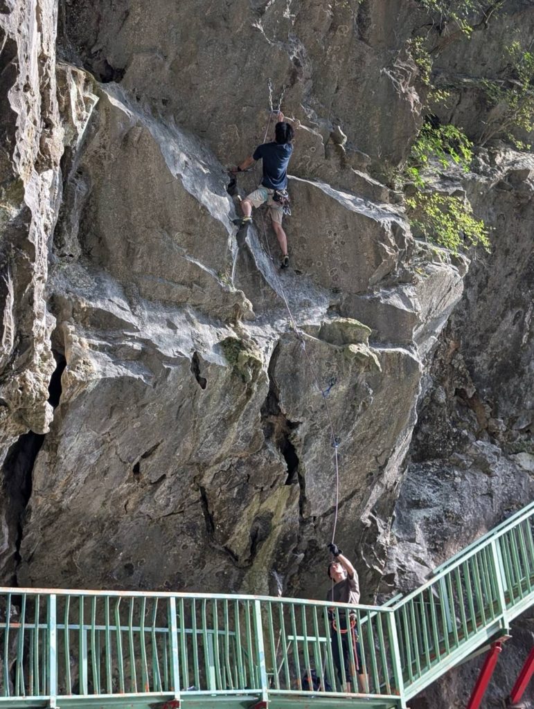 その後、す〜さんがその左隣にある「やせた胸5.11b」にチャレンジしますが、小さいホールドに苦戦します。なんとかトップアウトしクイックドローをかけるのが精一杯だったようです。