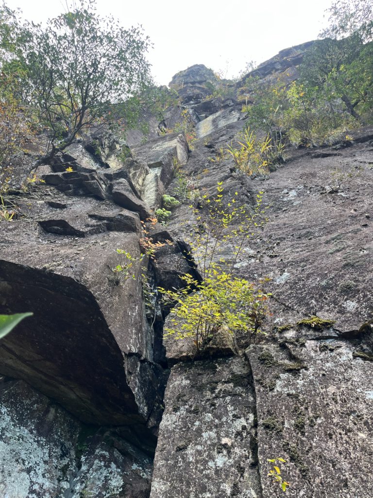 左側は大きく岩が崩壊したという事で、右側のカンテ沿いを登る。