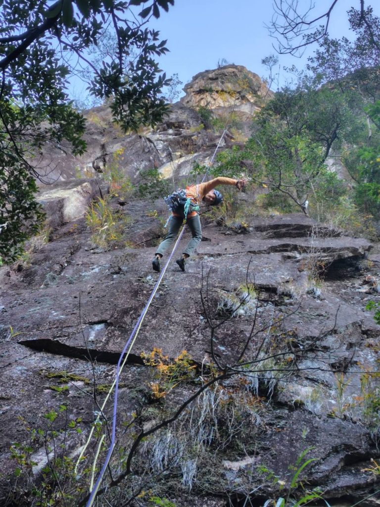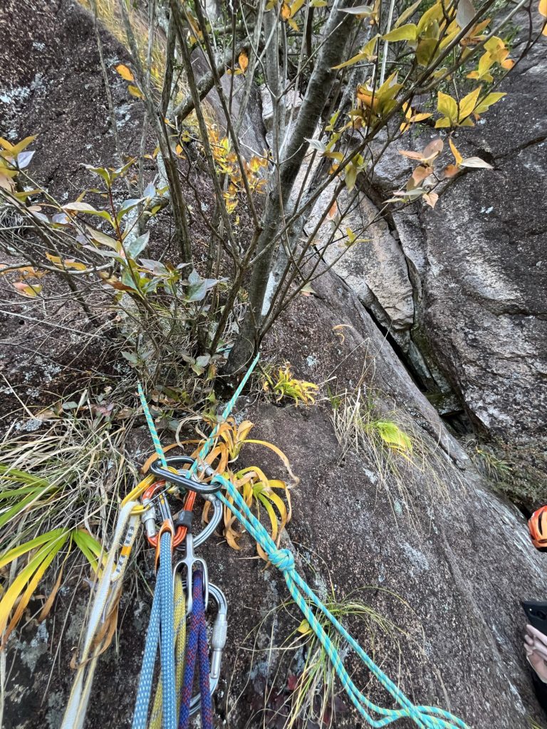 繋いでいるロープを解き、松の木にロープを回し懸垂下降で降りるが、登ってきた際のクイックドローとカムを回収しながら降りなければない。