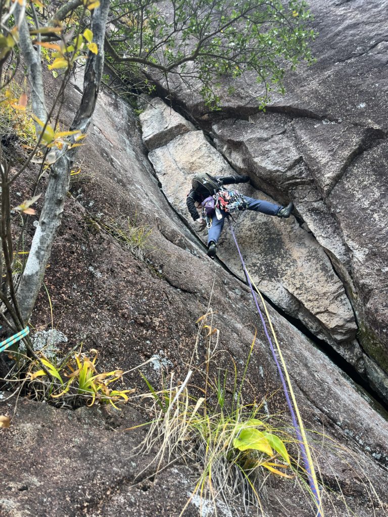 装備:カム0.2、0.3〜3×2、クイックドロー6本、アルパインドロー4本、ビレイ具一式、50mダブルロープ2本