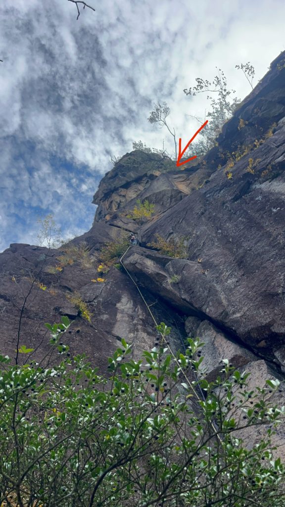 本来はここから直上し終了点だが、懸垂下降するため、右側にある松の木へ。