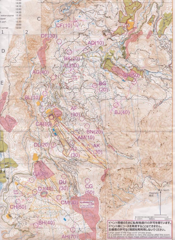 6:30-44の間にスタート,トイレに行ったりと,少し出遅れ,この枠の人たちはほとんどスタートしたようだ。昨日は,1分ごとのスタート枠に4チームずつだったけど,今日は1分ワクに1チームずつ,最後の枠は空いていたので,そこに並ぶと,前にどうぞと,声かけてもらった。なんでも,その枠はちょうど6:40スタートの枠で,ゴール関門を覚えやすいからだとか,なるほどーと思って,その枠に入らせてもらう。それでも枠内2チーム。今回も地図をもらって作戦タイム,ゴールの向こうのスキー場の先まで,エリアがある縦長の地図だ。ゴール近辺に30点以上のポイントがたくさんある。できるだけ早めにいゴール地点に行って,その辺りのポイントを全部取れたらいいなーと考える。そうすると,DH50に寄り道するのはリスクが大きい。BG20,BJ40もルートからは大きく離れているのでカット,さらに,最南部のBH40,AH70も厳しいだろうとカットする。CH50まで取って,残りの時間でゴールに近づきつつポイントを取っていく作戦にした。目標とするポイントの最南端のCH50までどうやって行くか考える。CF10は遠いので行かない。AD10は通り道なのでとる。BK20,DF30,AL30,AG40までは確定,BL10はどうするか?AG40からロードに出てDL20に向かうと距離が長すぎるし,ずっと走ると疲れるので,BL10を取って,蛇行するロードをショートカットすることにした。そのあとはDL20,CJ30,DJ40,CH50までいって,残りの時間でどうするか考えるってことになった。本日の作戦タイムは5分で終了(6:45)
