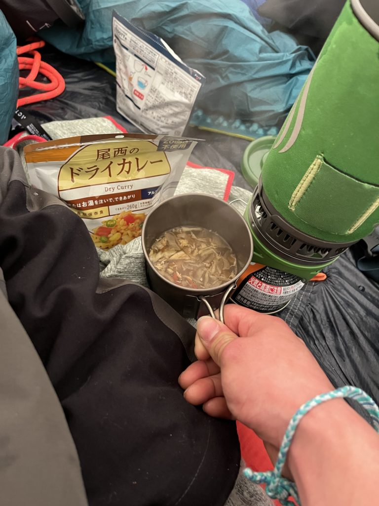 その後は、明日に備え早めに就寝。エアーマットが破けて、中々眠れなかった。