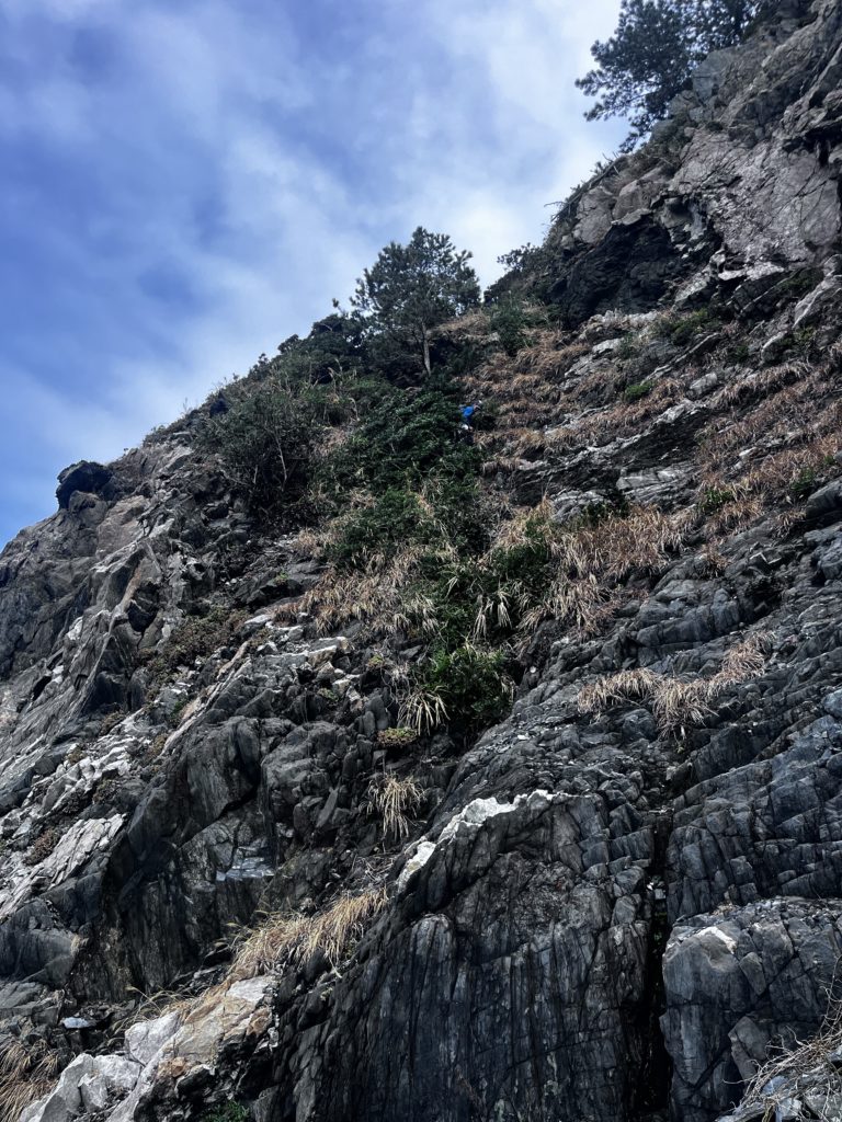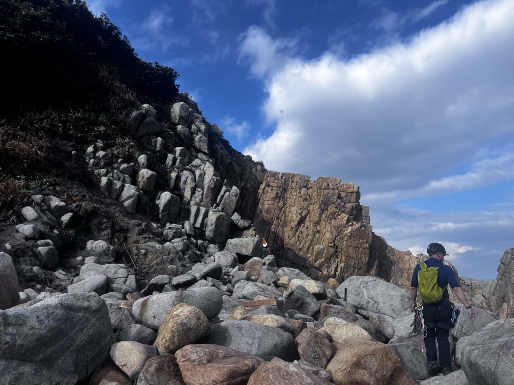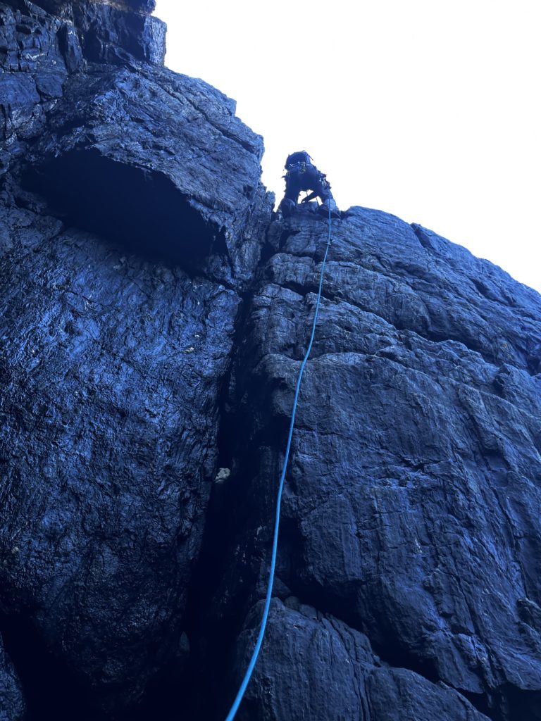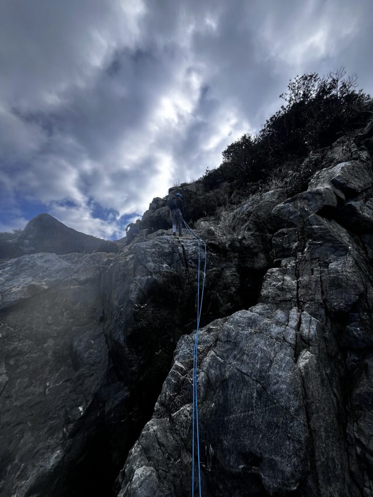 フリーで登れなくはないが雨で濡れていたので迷わずロープを出した。